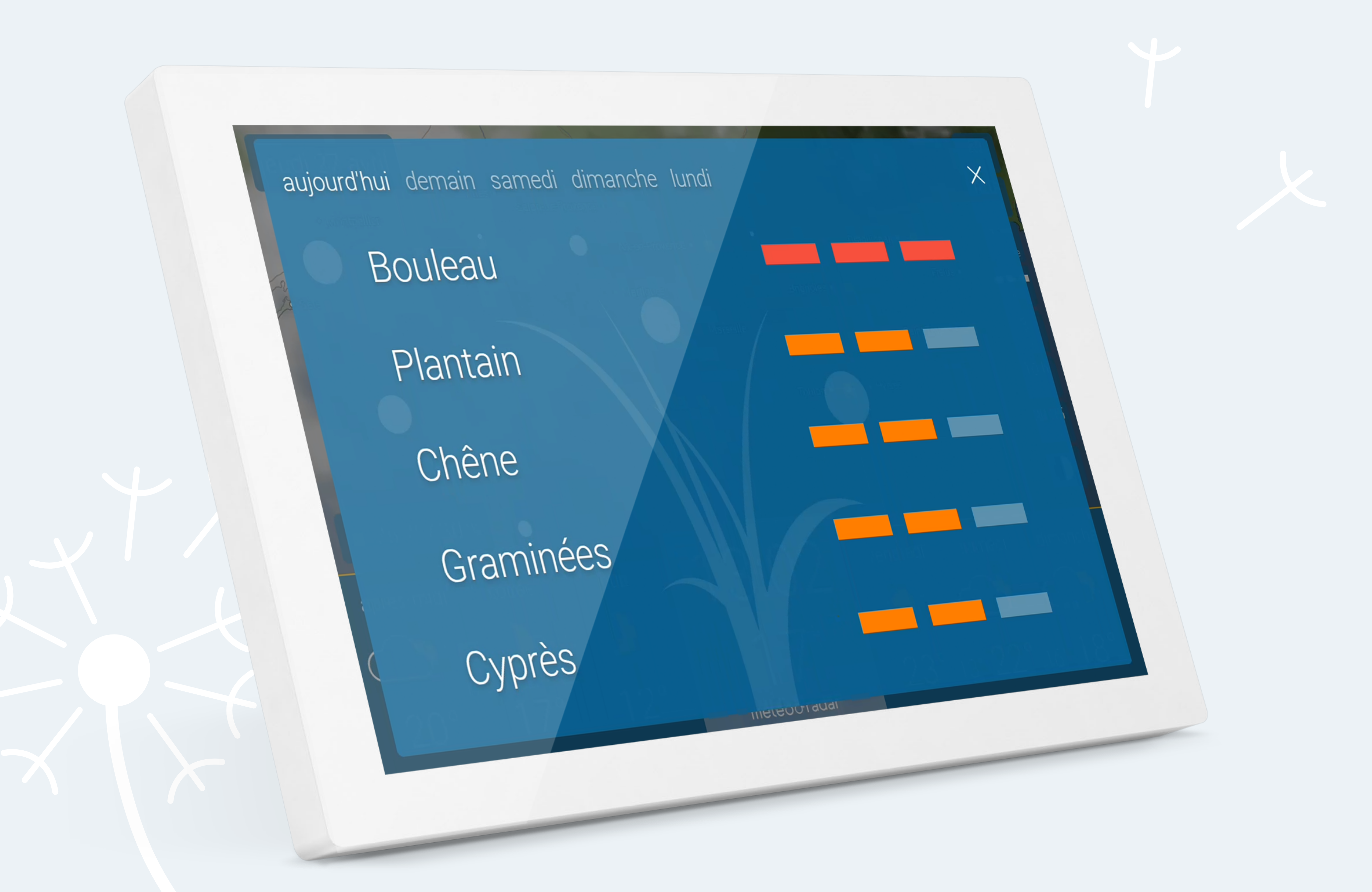 - Infos pollens avec l'intensité de pollinisation pour les 5 prochains jours et calendrier pollinique